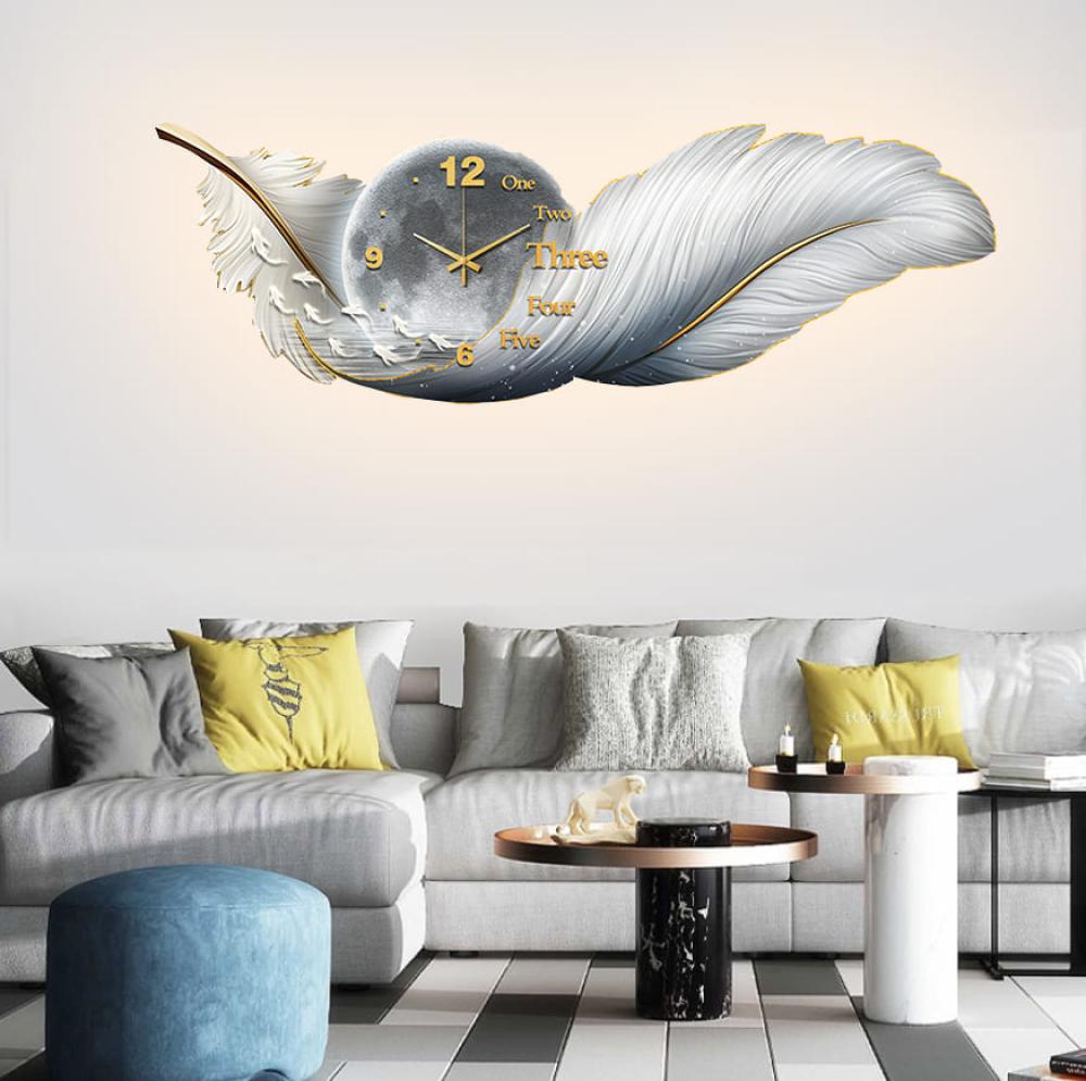 ساعة جدارية بتصميم ريشة فاخرة تضيف لمسة من الأناقة والنعومة إلى أي مساحة.